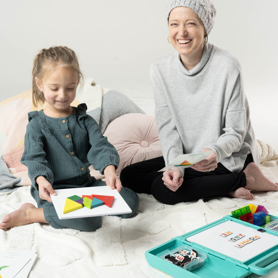 - Magnetic tangram set- 7 wood shapes and 10 double-sided image cards