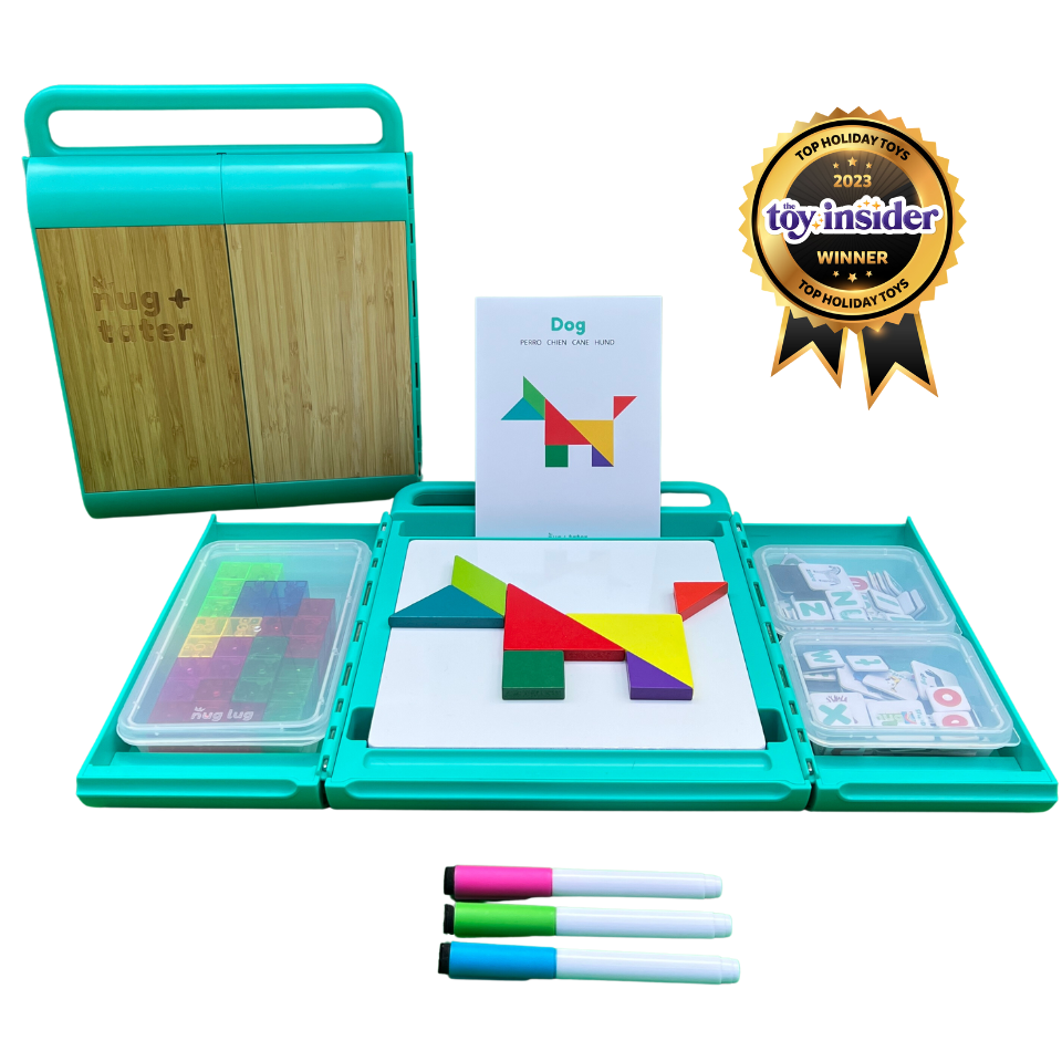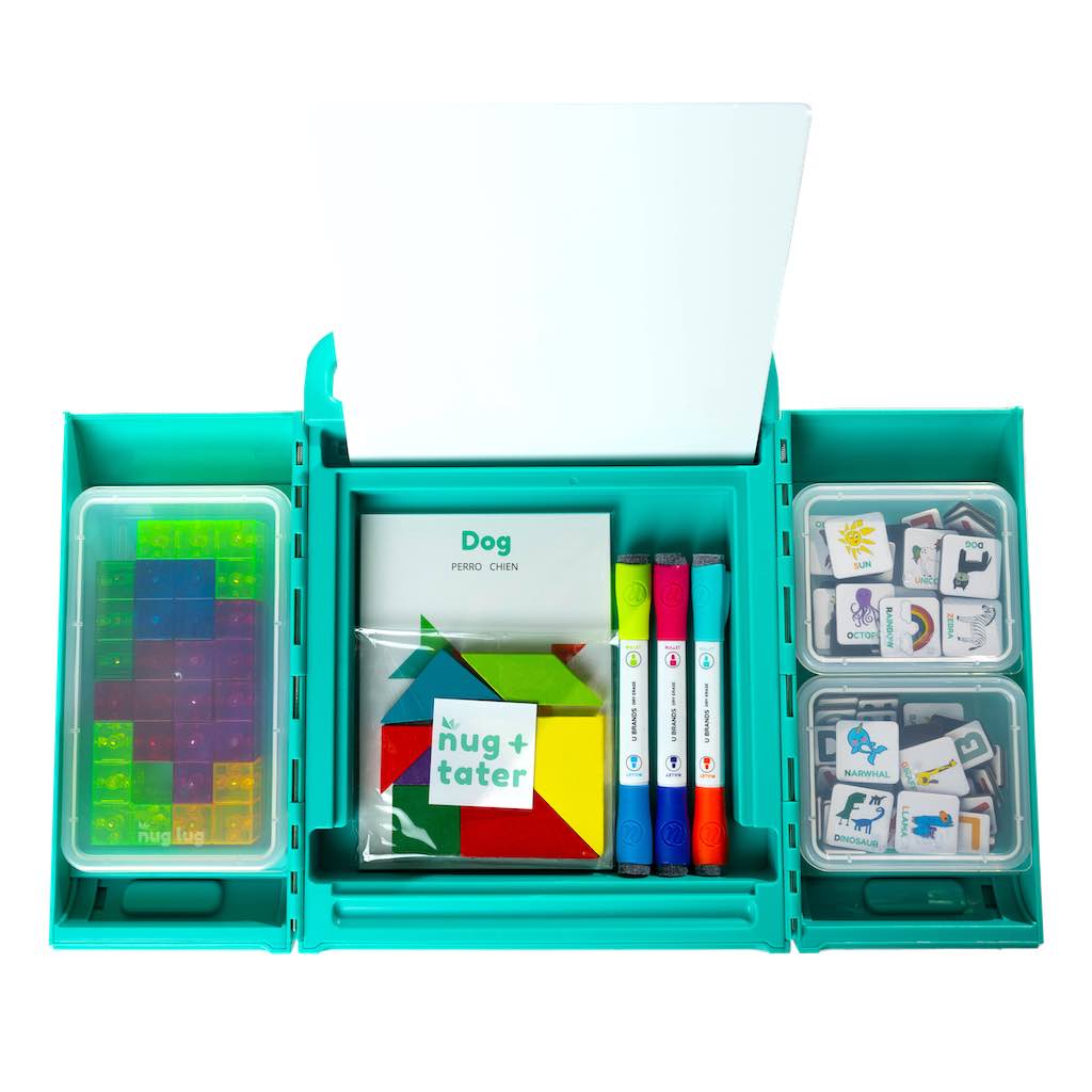 Description: The NugLug is a portable educational system designed to stimulate the intellectual curiosity of a child. Intentionally designed as a screen-free activity, it provides for hours of creative play. The modular design allows for interchangeable activities to accommodate a range of ages and interests. The NugLug includes a whiteboard for drawing and game play, alphabet tiles, tangram puzzles and 3-dimensional magnetic building blocks. The food grade containers can also be used to pack snacks for families on-the-go.